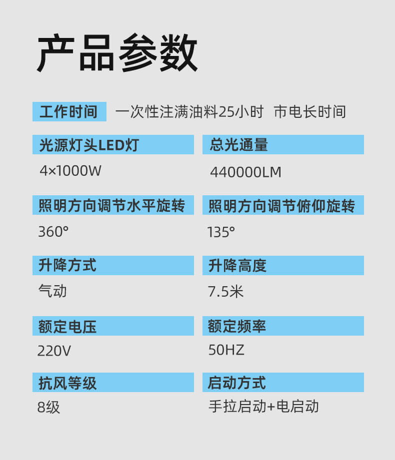 適用于維護搶修、事故處理、防汛抗洪、搶險救災等大面積照明。