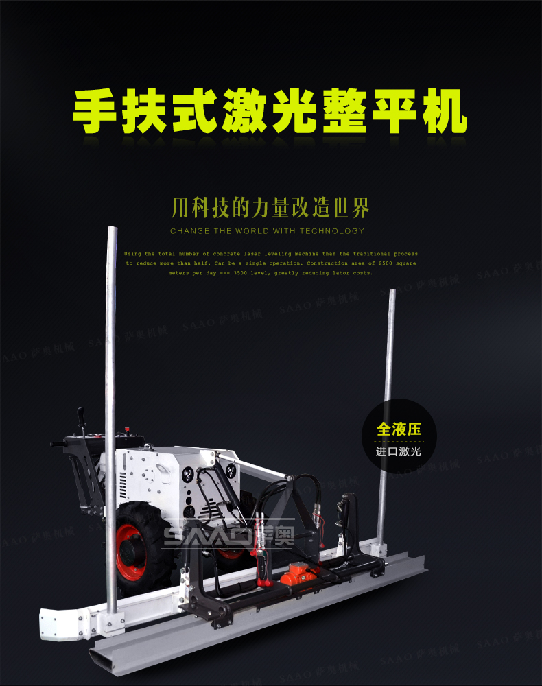 手扶激光整平機的性能優勢: 1,傳統的地坪施工多采用人工支模,振動棒振搗整平,人工操作的地坪常有密實度不均勻,平整度差以及作業效率低等缺點; 2,本產品的激光控制系統通