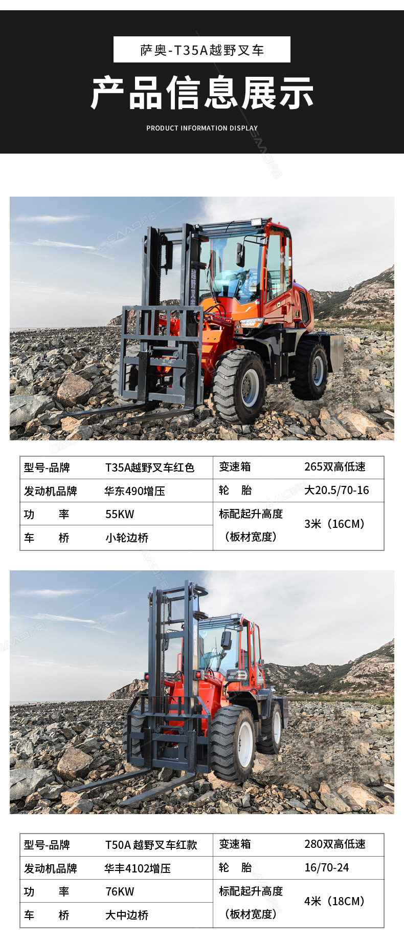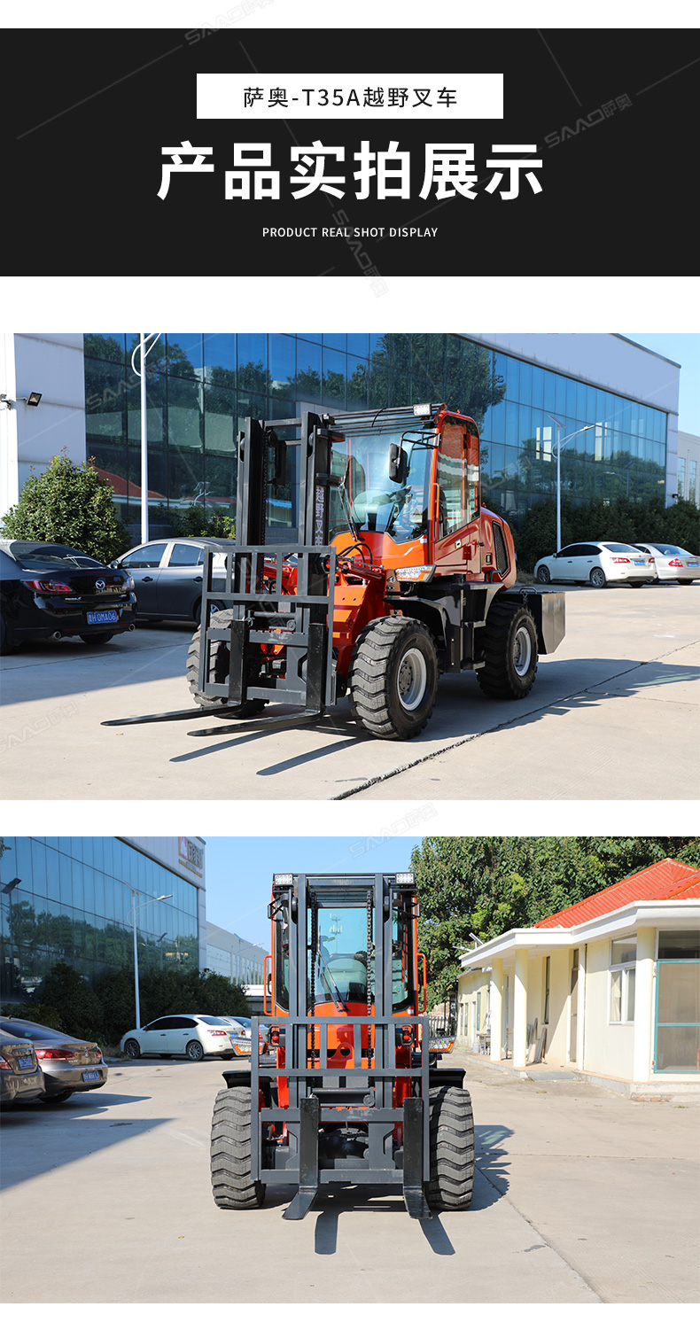 3.普通叉車只能在平整的路面上作業,而越野叉車既可以在普通路面上作業,還可以在山路泥路崎嶇道路作業,輪胎抓地力強,不打滑。