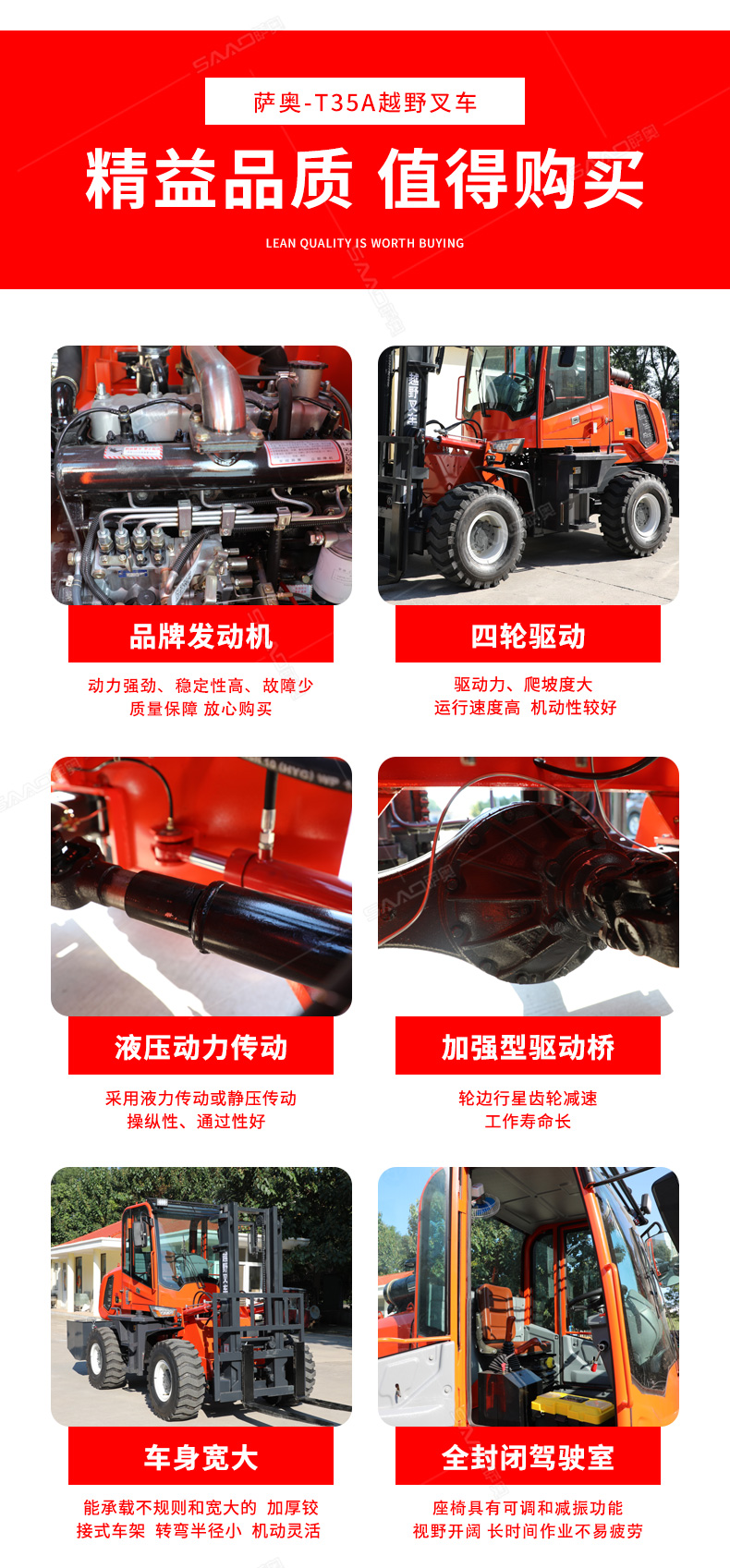9.越野叉車杰出的離地間隙,特制的越野輪胎。前橋帶防滑差速裝置的四輪驅動。使發動機與變速箱之間上設計的更加緊湊。能夠在惡劣的地區如崎嶇地形,沙地和泥地上作業。