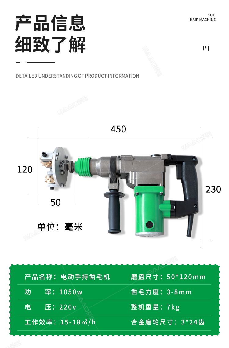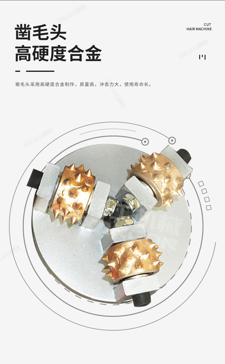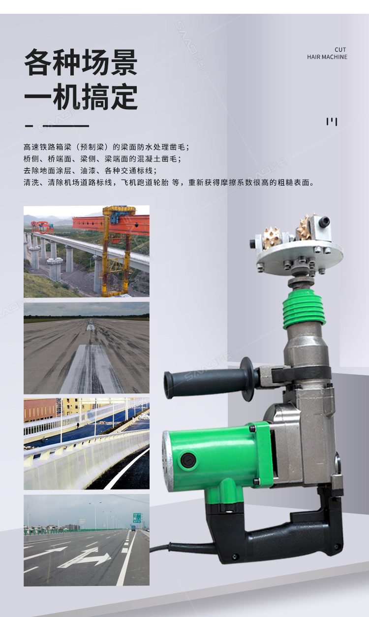 電動手持式鑿毛機 金剛石三頭鑿毛設備 小型水泥路面拉毛機 功率:1050w 工作效率:15-18㎡/h 電壓:220v 磨盤尺寸:50*120mm 合金磨輪尺寸:3*24齒 鑿毛深度:3-8mm 整機重量:7kg