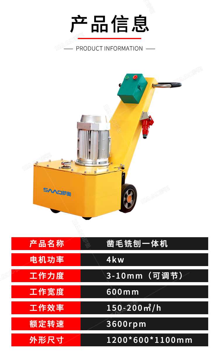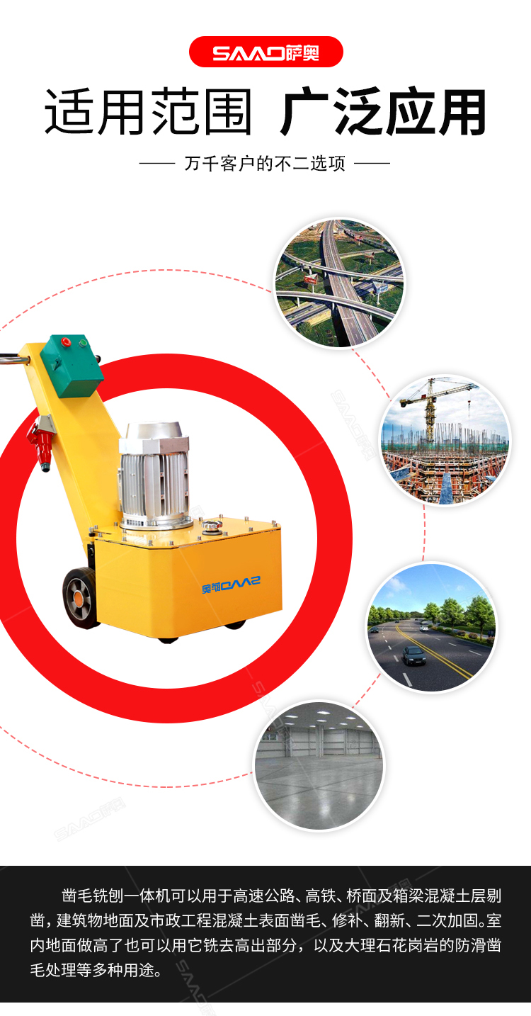 一、產(chǎn)品簡(jiǎn)介: 鑿毛銑刨一體機(jī),不需要空壓機(jī),純電動(dòng),主要用于高速公路,高鐵,橋面及箱梁混凝土面層剔鑿,建筑物地面及市政工程混凝土表面鑿毛,修補(bǔ),翻新,二次加固。室