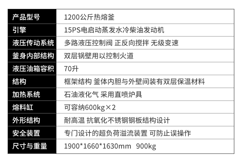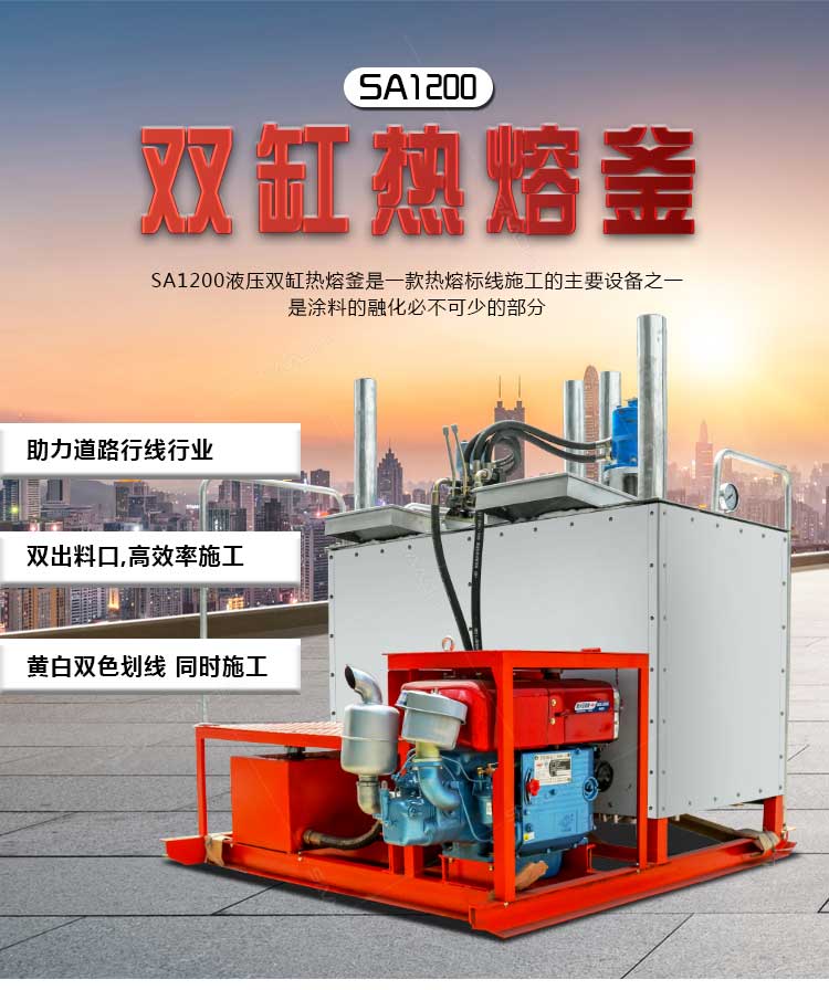 SA1200液壓雙缸熱熔釜是一款熱熔標線施工的主要設備之一。標線施工時,先利用熱熔釜將粉末狀涂料加熱,攪拌,直到熱熔變成液態后,再將涂料放入劃線機內進行劃線施工。由于涂料