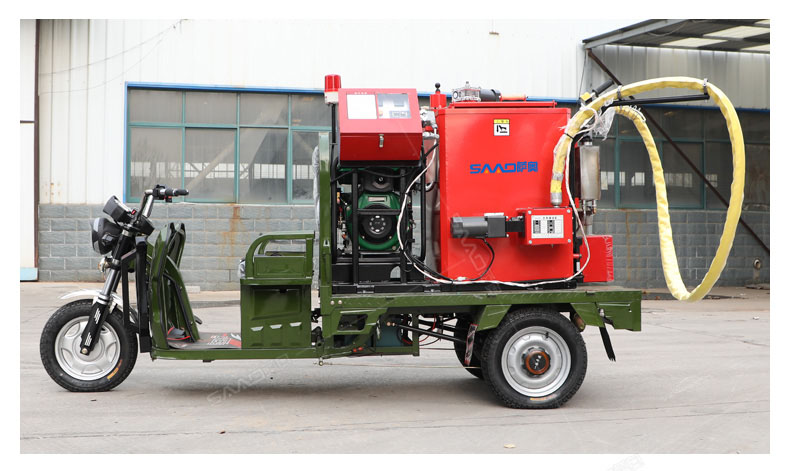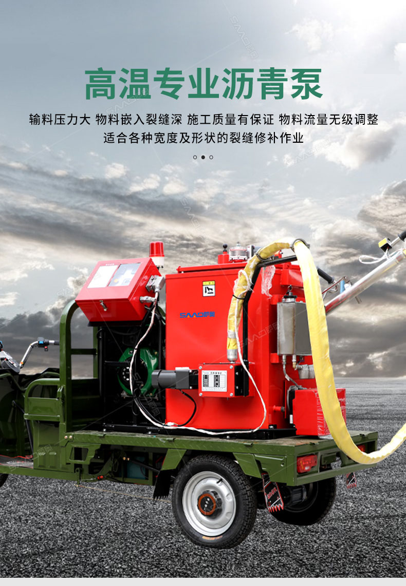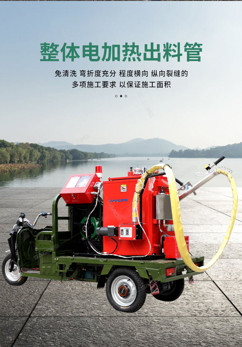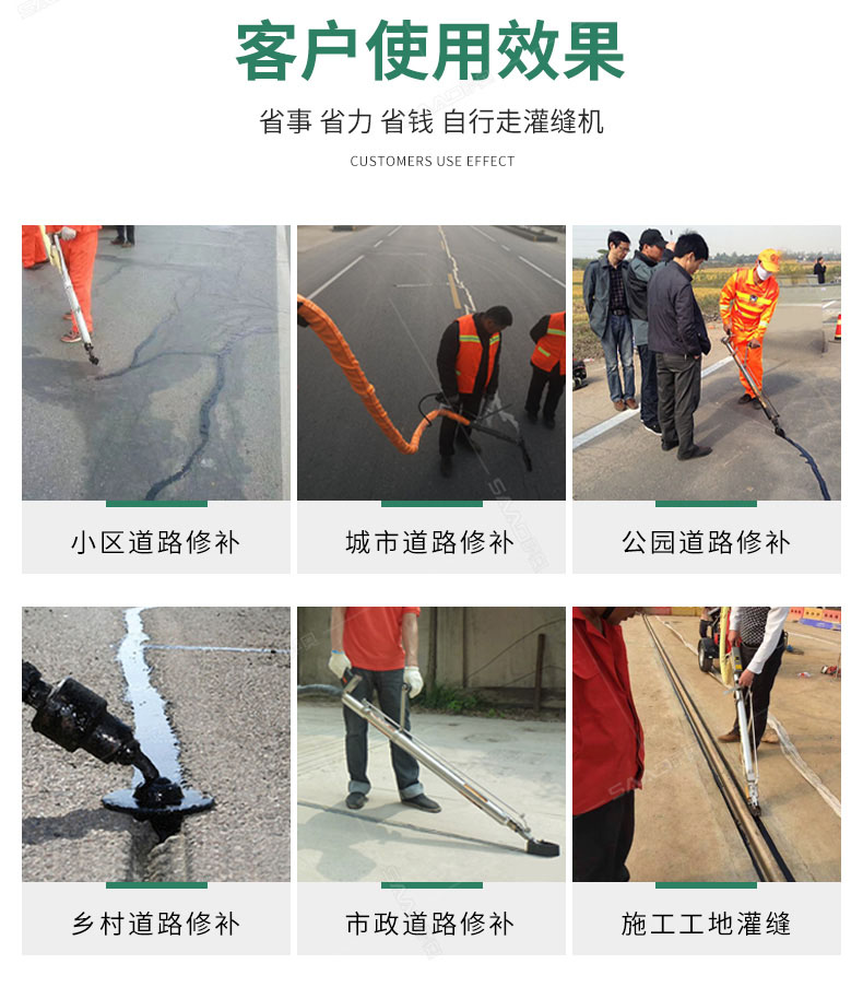 汽油灌縫機主要有手推式和自行式手持灌縫管操作,采用進口柴油燃燒器加熱。在工作時首先在料箱內(nèi)加入瀝青或灌縫膠,啟動發(fā)電機供電,依次間斷打開導熱油泵開關,燃燒器開關,出料管加熱開關;調(diào)整自動溫控系統(tǒng)與材料的溫度相同,通過柴油燃燒器自動加熱熔料箱內(nèi)導熱油開始升溫(拖式為強制循環(huán))使材料融化,溫度是通過自控系統(tǒng)來控制。溶料時間大約30-40分鐘左右。在材料融化、出料管溫度達到后可以進行工作。手持灌縫管對正裂縫灌縫處理。瀝青泵的出料流量可調(diào)。在工作過程中隨時添加材料保證工作的連續(xù)性。