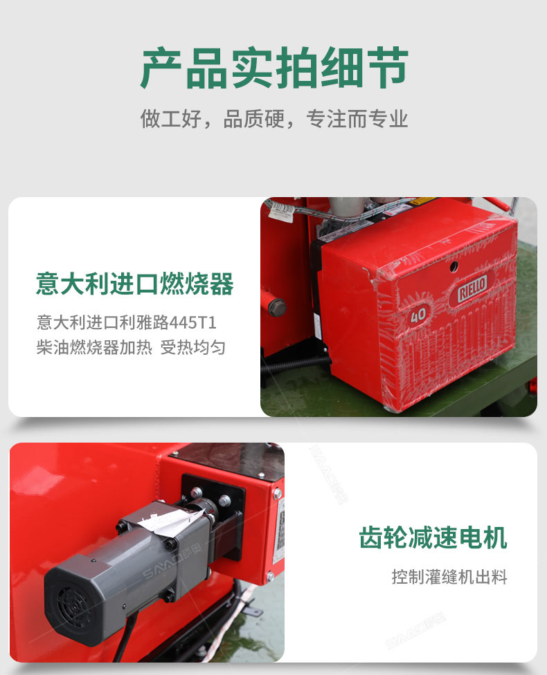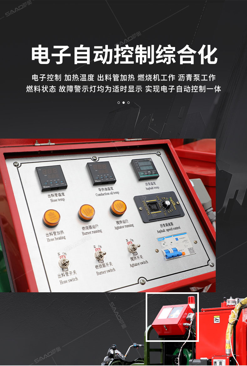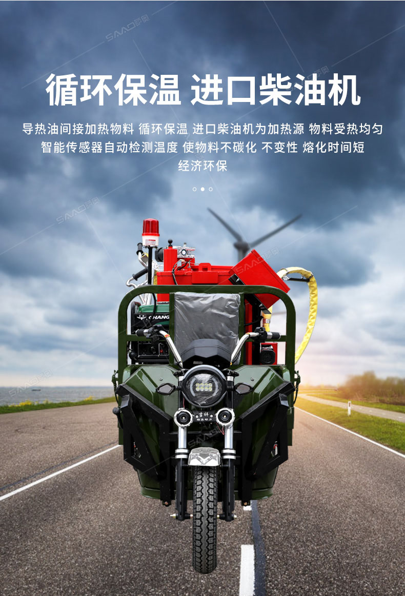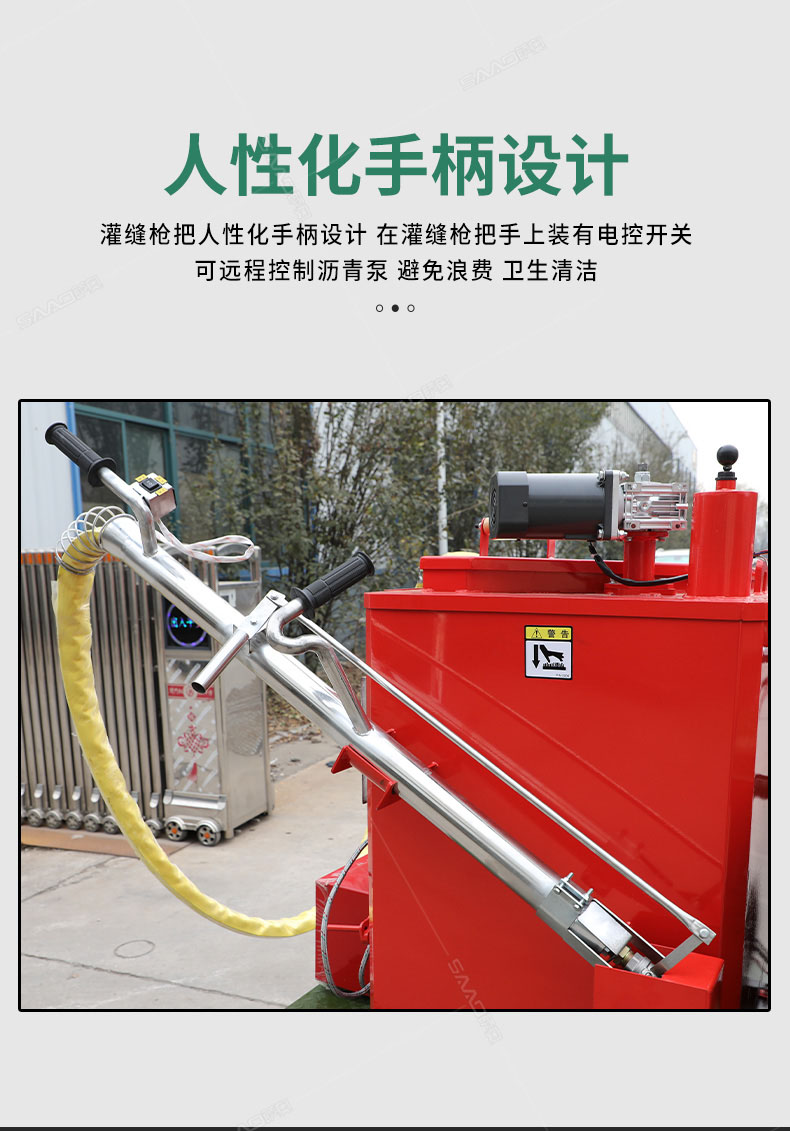 汽油灌縫機主要有手推式和自行式手持灌縫管操作,采用進口柴油燃燒器加熱。在工作時首先在料箱內(nèi)加入瀝青或灌縫膠,啟動發(fā)電機供電,依次間斷打開導熱油泵開關,燃燒器開關,出料管加熱開關;調(diào)整自動溫控系統(tǒng)與材料的溫度相同,通過柴油燃燒器自動加熱熔料箱內(nèi)導熱油開始升溫(拖式為強制循環(huán))使材料融化,溫度是通過自控系統(tǒng)來控制。溶料時間大約30-40分鐘左右。在材料融化、出料管溫度達到后可以進行工作。手持灌縫管對正裂縫灌縫處理。瀝青泵的出料流量可調(diào)。在工作過程中隨時添加材料保證工作的連續(xù)性。