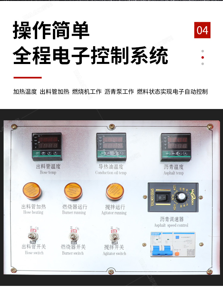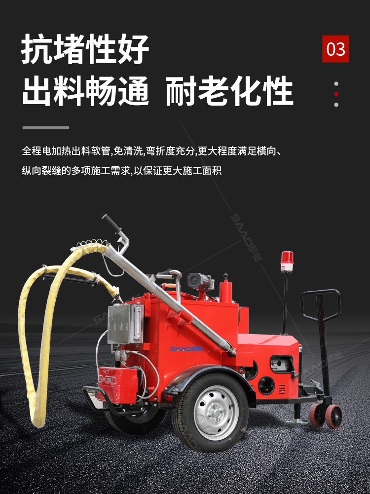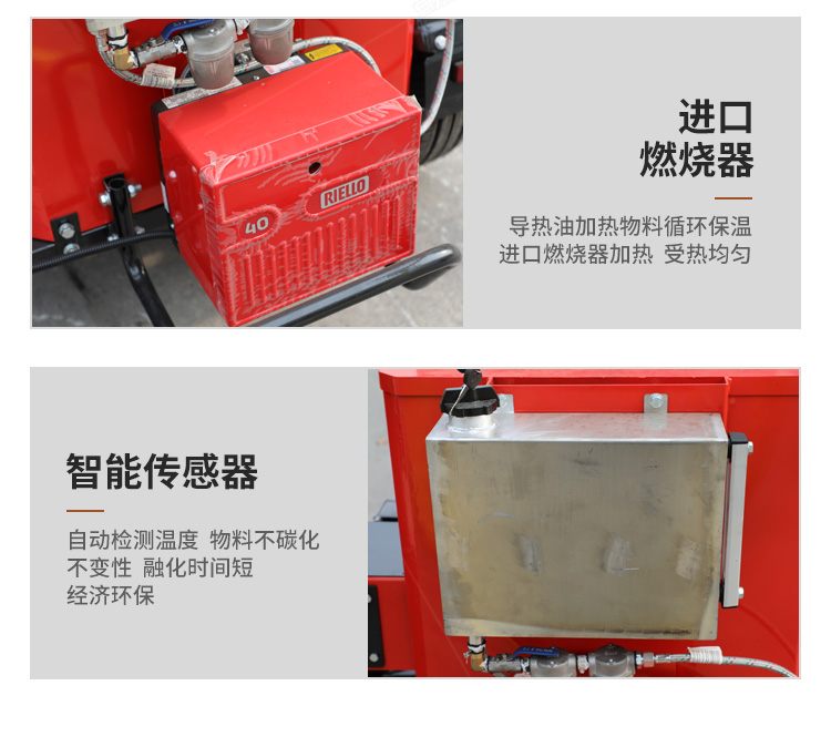 灌縫機主要有手推式和自行式手持灌縫管操作,采用進口柴油燃燒器加熱。在工作時首先在料箱內加入瀝青或灌縫膠,啟動發電機供電,依次間斷打開導熱油泵開關,燃燒器開關,出料