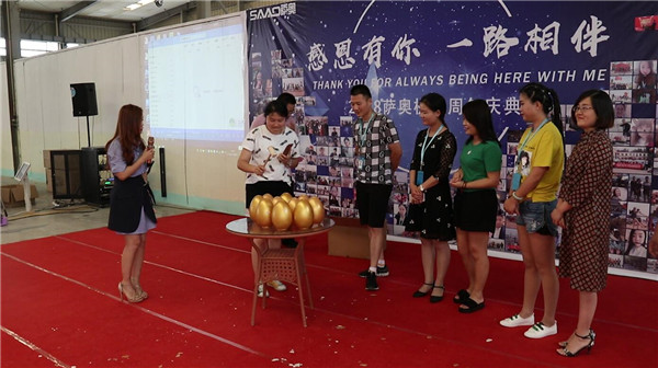 很多時候都不得不感慨一句,薩奧真的是人才濟濟。既然是周年典慶,那么才藝表演自然少不了。在一輪又一輪的才藝表演過后,接下來就展開了砸金蛋的環(huán)節(jié)。桌上放著10個金蛋,每個金蛋里都放了數(shù)額不同的人民幣,選出10個表現(xiàn)好的員工,依次砸金蛋,砸哪個金蛋,哪個金蛋里的錢就屬于自己。是不是很好玩啊?