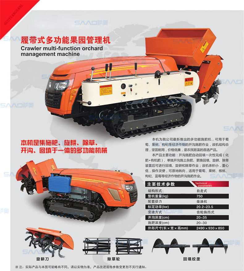 本機(jī)器產(chǎn)品是集施肥、旋耕、除草、開溝、回填于一體的多功能機(jī)械;本機(jī)為公司推出的多功能施肥機(jī),可用于葡萄、果樹、枸杞等經(jīng)濟(jì)作物的開溝施肥作業(yè)。該機(jī)結(jié)構(gòu)合理,堅固耐用,價位低廉,是農(nóng)民致富的良好產(chǎn)品。