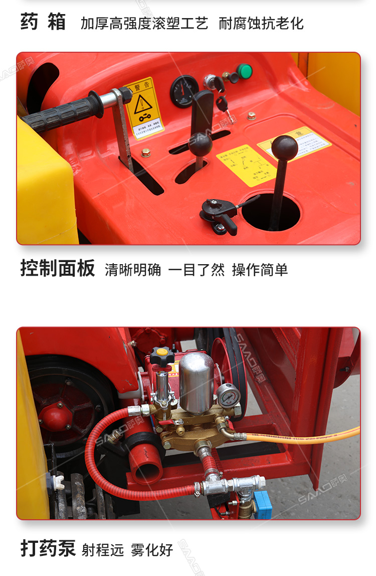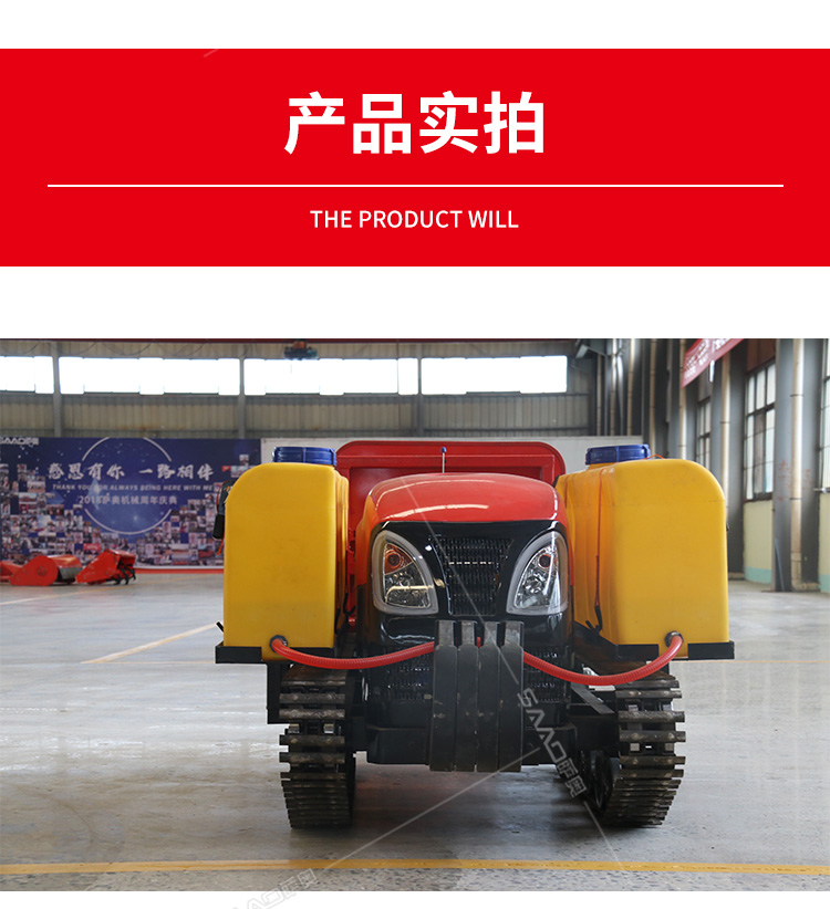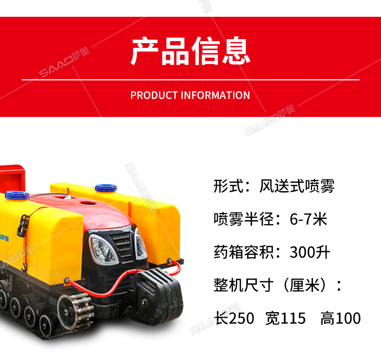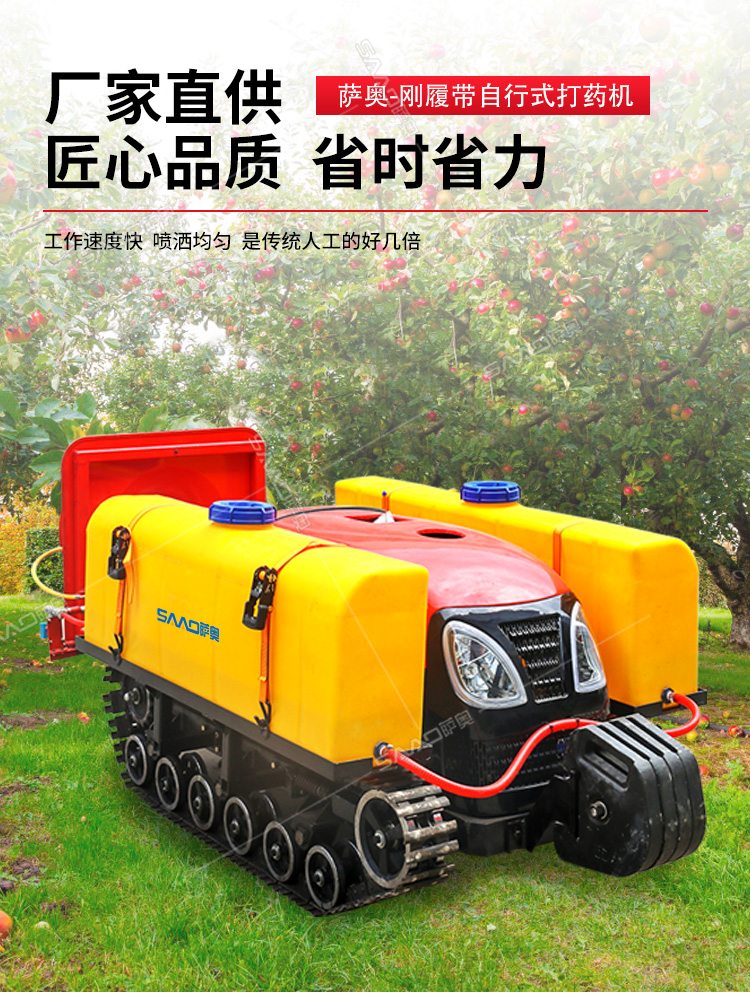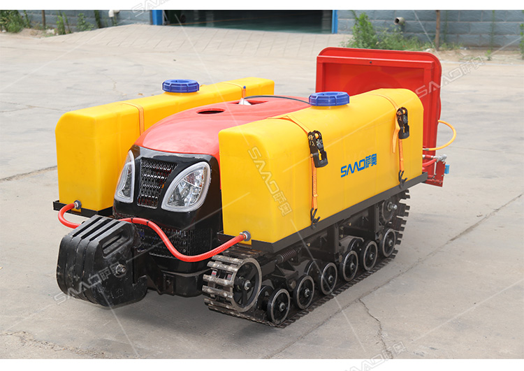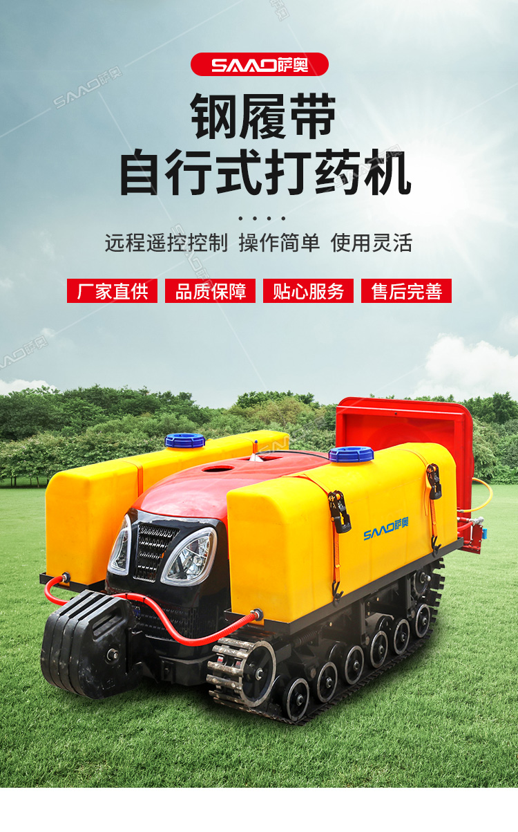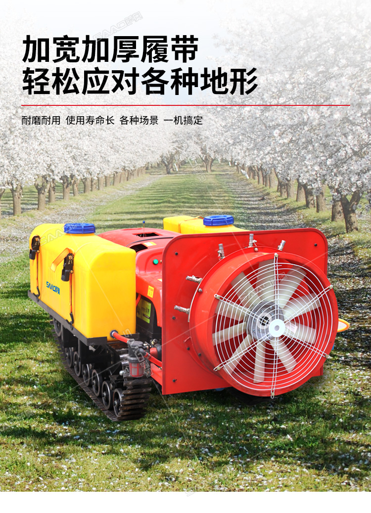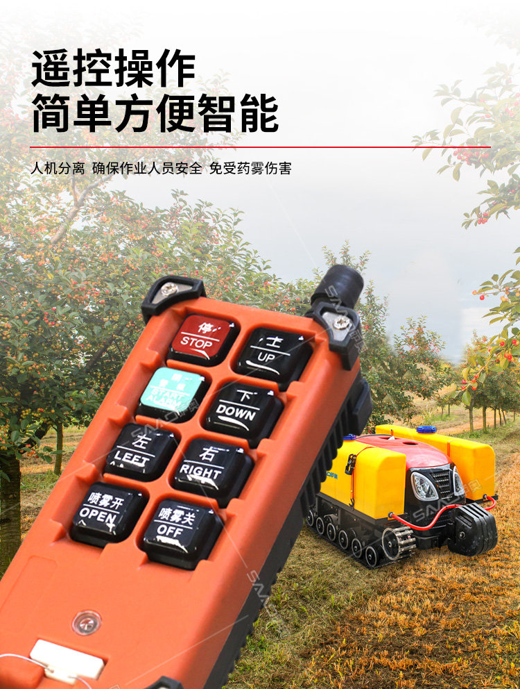 28馬力鋼履帶自行式打藥機,風送式噴霧機,霧化好,噴射距離遠;遙控操作,人機分離,確保作業人員安全,免受藥霧傷害。