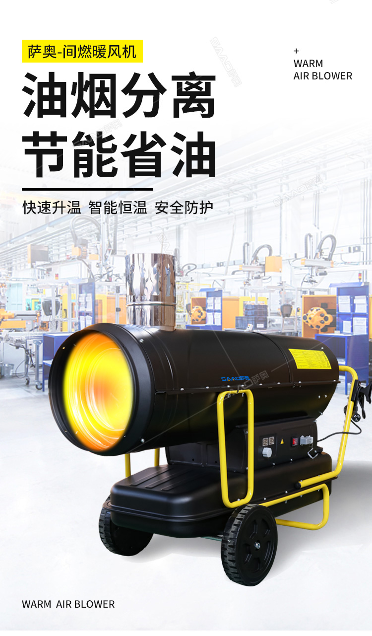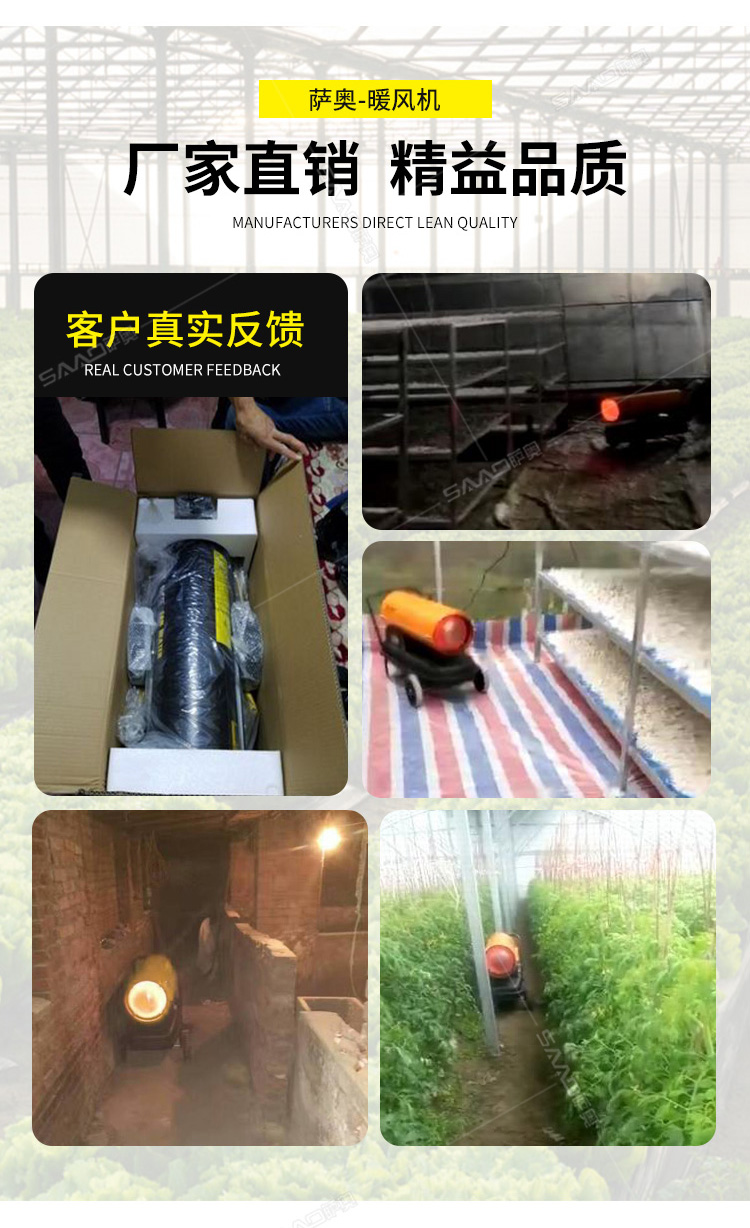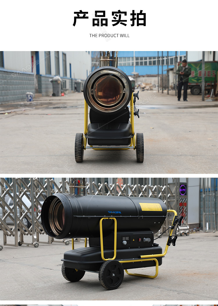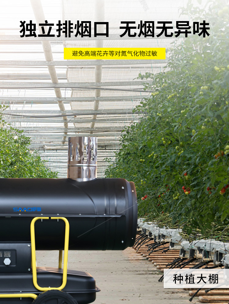 間燃暖風機的應用范圍可以說是非常廣泛的,主要可以應用于大棚育植、食品烘干、茶葉烘干、育雛養殖、 木材解凍、戶外演出等需要供暖供熱的場所,此外,配有光電保護裝置、結構