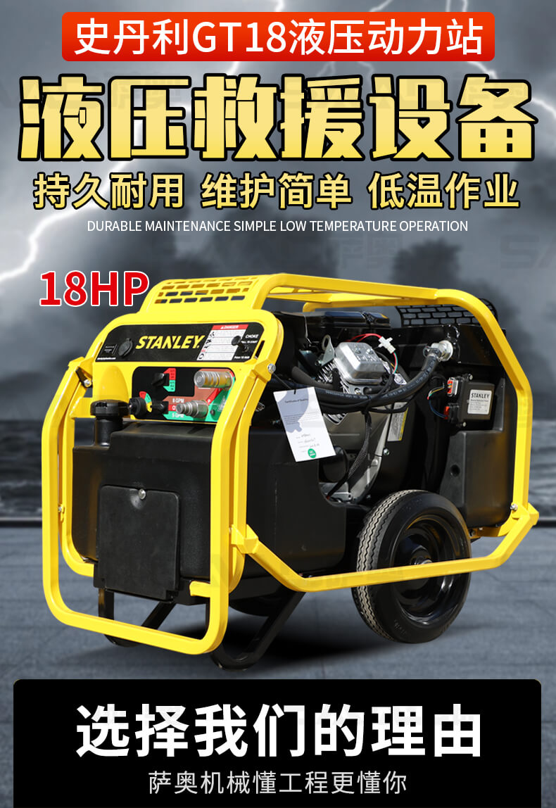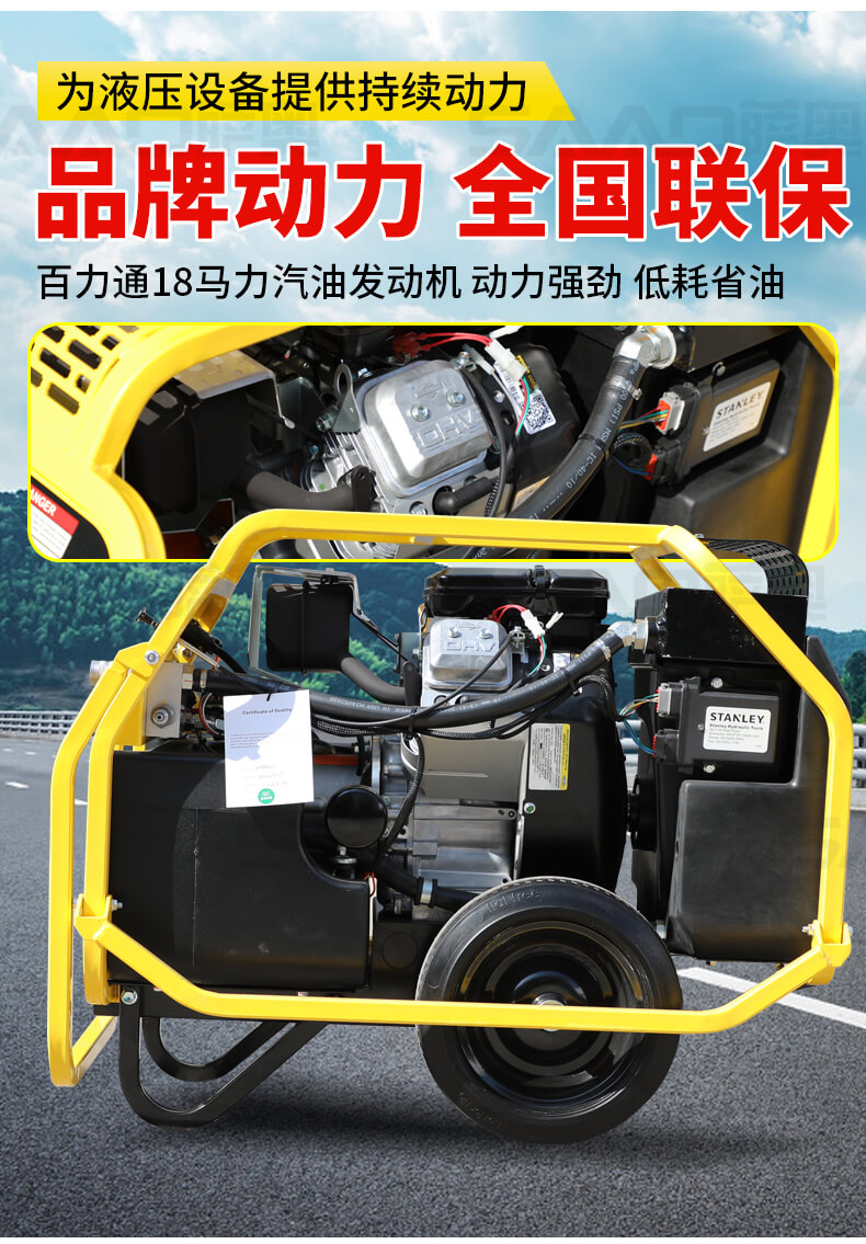 產 品介紹 GT18動力站是為液壓設備提供持續動力的,它同時滿足1類和2類液壓設備。它采用百力通18馬力汽油發動機,有良好的液壓油散熱系統,以滿足液壓設備可以正常、持久地工作。