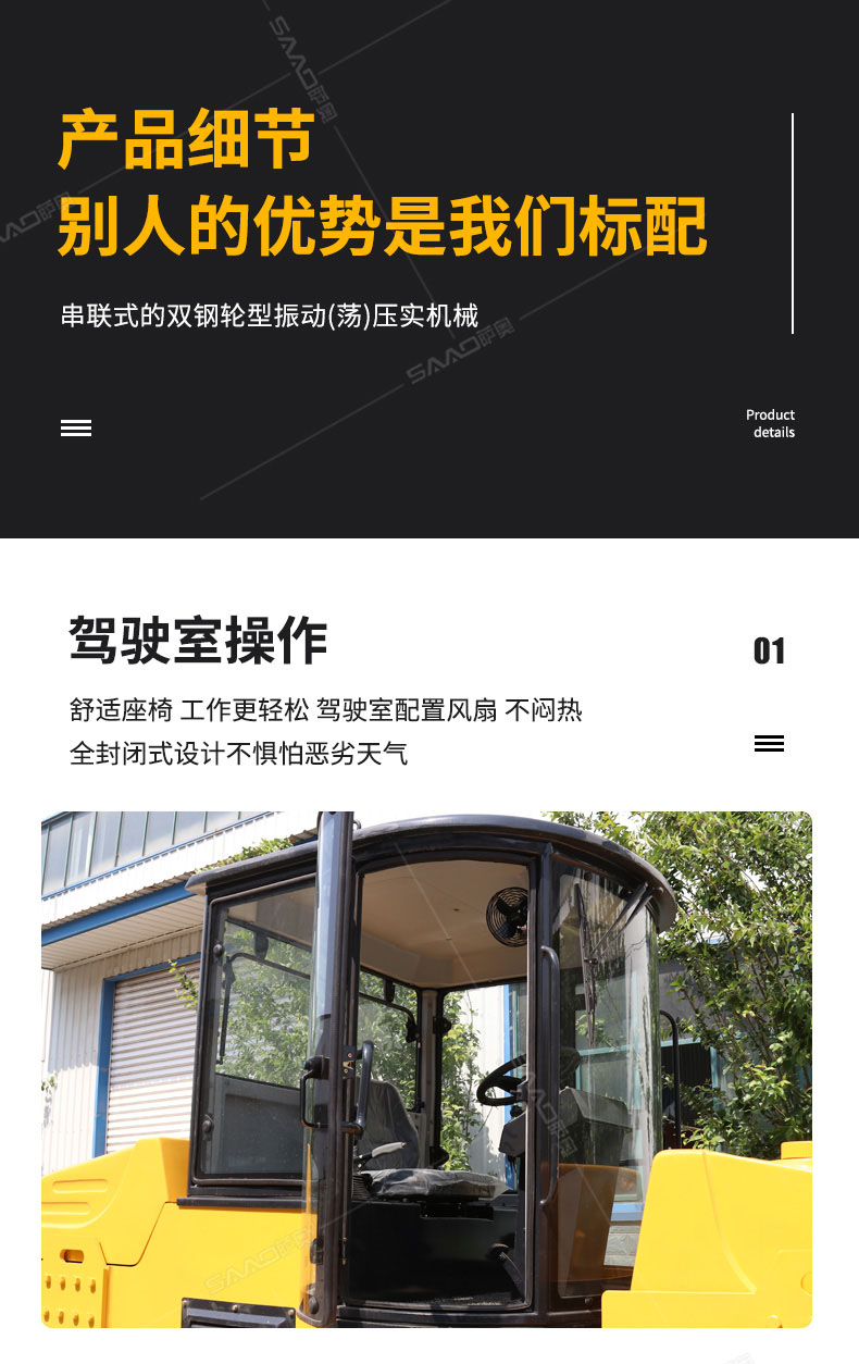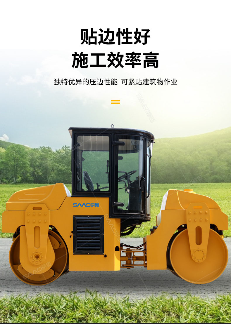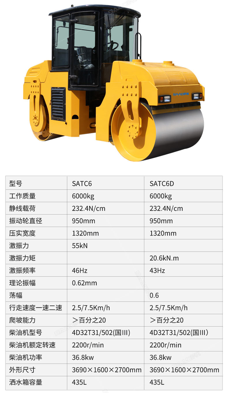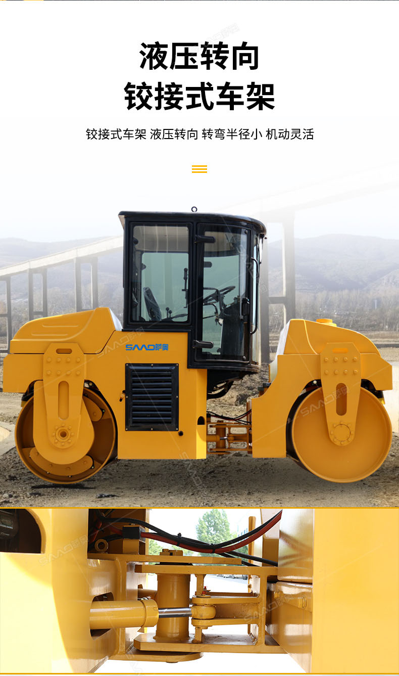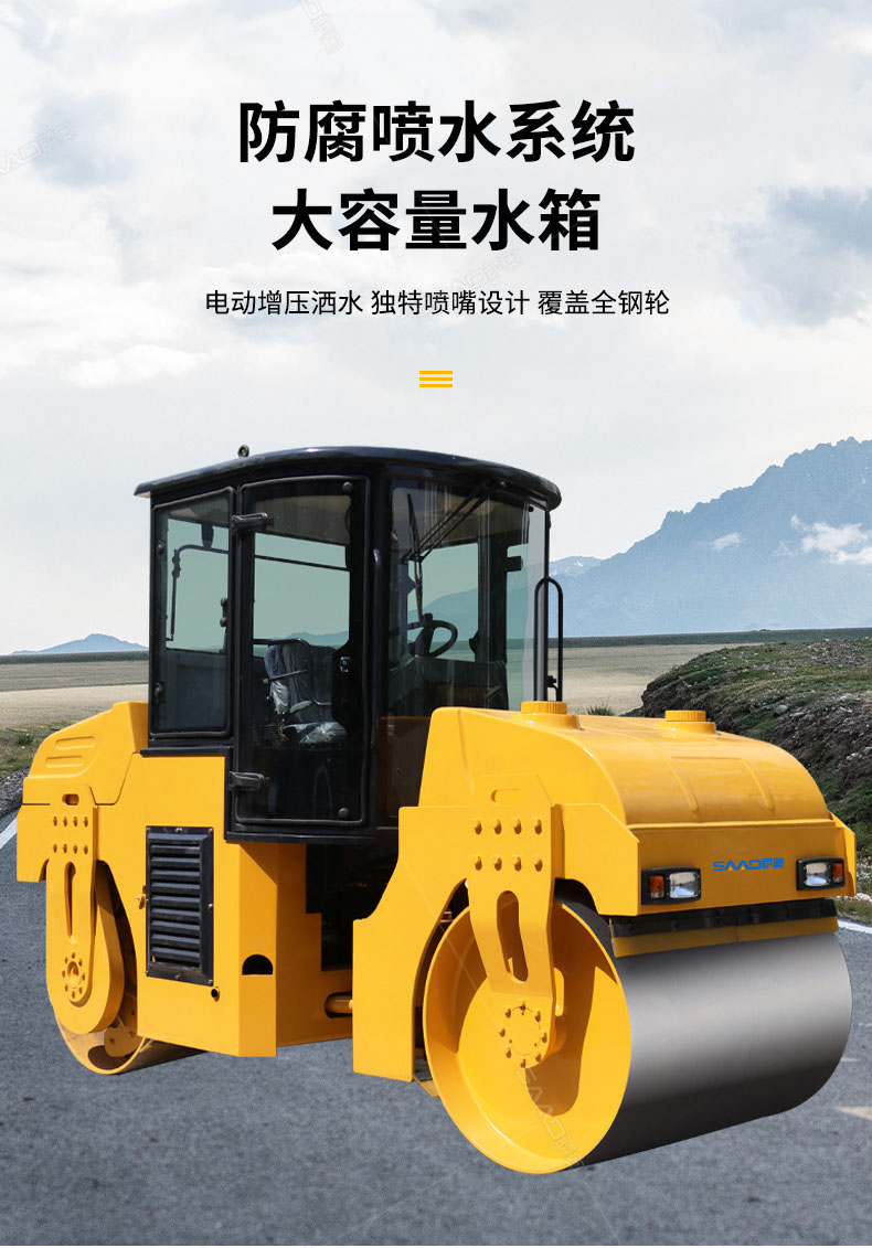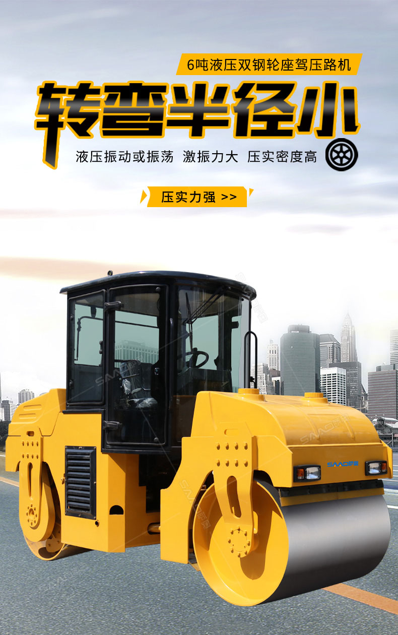 SAC6型振動(dòng)壓路機(jī)(SAC6CD型振蕩壓路機(jī))是一種串聯(lián)式的雙鋼輪型振動(dòng)(蕩)壓實(shí)機(jī)械;該機(jī)主要由鉸接式車架、振動(dòng)(蕩)輪、轉(zhuǎn)向輪,動(dòng)力裝置、液壓振動(dòng)、液壓轉(zhuǎn)向、操縱機(jī)構(gòu)、電動(dòng)灑水和
