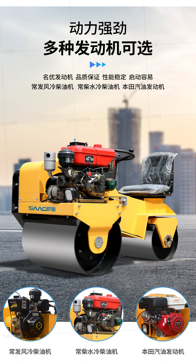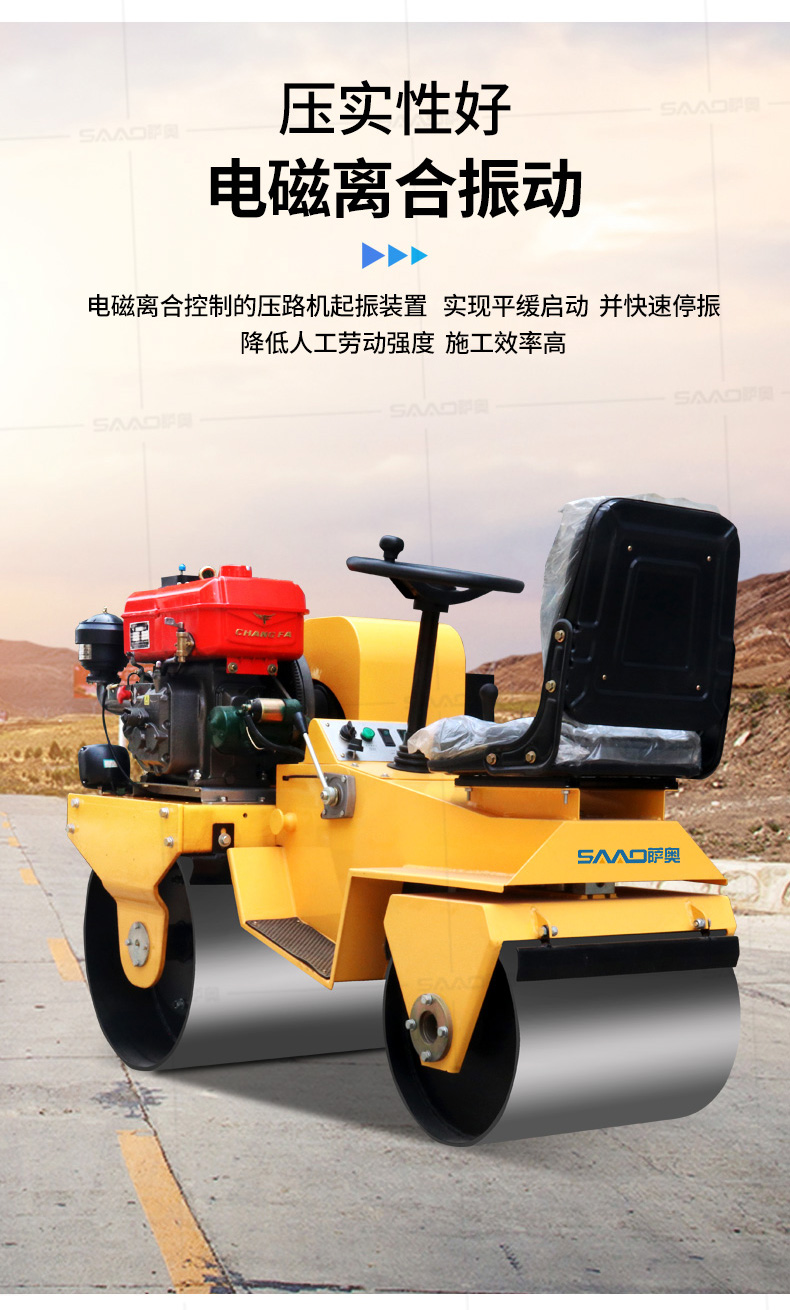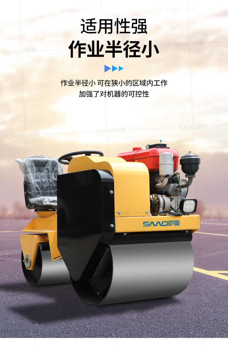 用于壓實瀝青表面,壓實礫石、沙土等工程基礎,碾壓草坪,作業半徑小,可在狹小的區域內工作;國內名優柴油機,名牌品質保證,性能優越,啟動容易;
