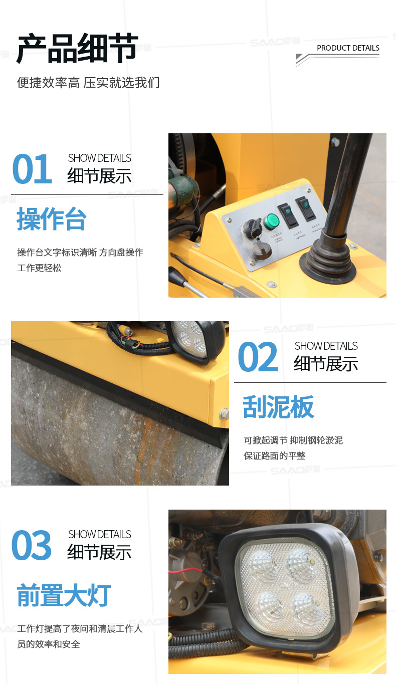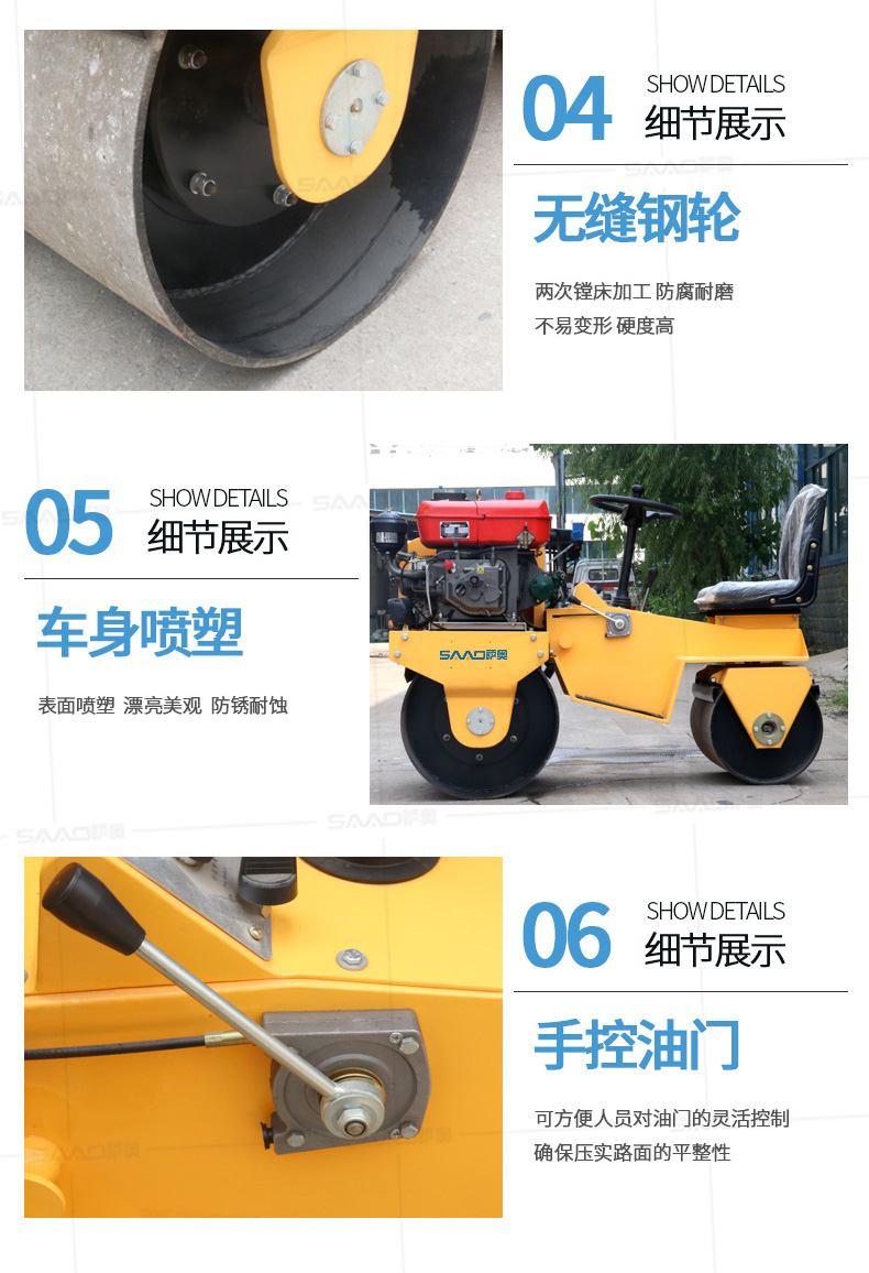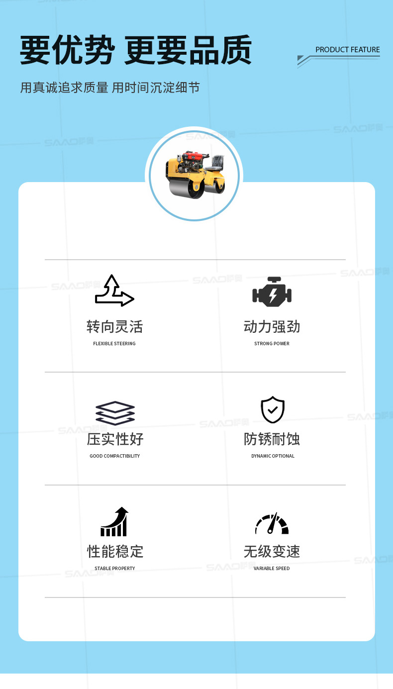 用于壓實瀝青表面,壓實礫石、沙土等工程基礎,碾壓草坪,作業半徑小,可在狹小的區域內工作;國內名優柴油機,名牌品質保證,性能優越,啟動容易;