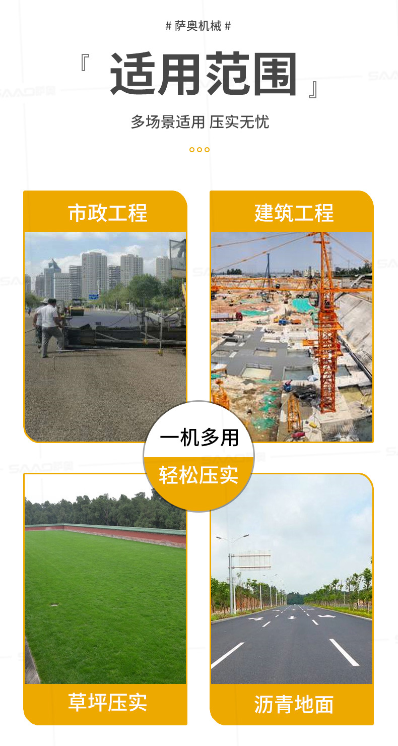 本產品是小型自行式振動壓路機,主要適用于壓實各種非粘結性土壤、沙土、礫石、砂石混合料、穩定土以及瀝青混凝土等建筑和筑路材料,尤其在鄉間道路、大型社區道路、水利建設